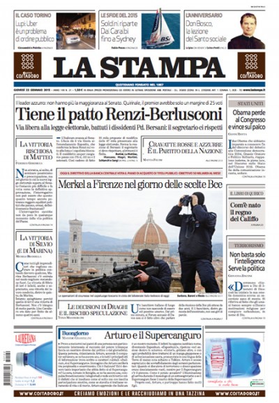 L’apertura di tutti i quotidiani di oggi è per il voto al Senato sul maxiemendamento alla riforma della legge elettorale che ha tagliato il voto su quasi tutti gli emendamenti presentati dalle opposizioni per rallentarne l’approvazione: il maxiemendamento è stato approvato con una maggioranza che comprende anche Forza Italia e ha superato così anche l’opposizione della minoranza del PD, e i giornali associano questo voto al prossimo voto per il nuovo Presidente della Repubblica, preannunciando un’intesa fra PD e Forza Italia su un nome condiviso (per il momento il più citato è Giuliano Amato). Avvenire titola invece sull’attesa per le misure di stimolo all’economia che dovrebbero essere decise oggi dalla Banca Centrale Europea.