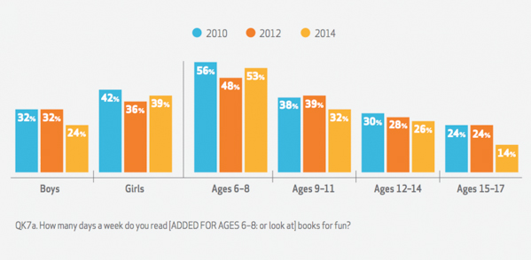 Per decenni i ricercatori hanno sostenuto che una sorta di “divertimento regolato” con i libri possa aiutare i ragazzi ad apprezzarli, e che quelli che amano leggere tendono a diventare lettori migliori. Questo studio ha portato molti insegnanti a difendere la scelta di dedicare parte dell’orario scolastico alla lettura di piacere. Un altro recente studio spiega che i sentimenti dei bambini di 8-9 anni nei confronti della lettura consentono di fare una previsione sui risultati che conseguiranno nei test di lettura intorno ai 12-13 anni, indipendentemente da come leggevano quando erano più piccoli. La ricerca di Scholastic – come alcune altre – spiega che oggi i ragazzi leggono meno per divertimento. Il 31 per cento dei ragazzi tra i 6 e i 17 anni dice di leggere per piacere personale almeno cinque giorni a settimana: nel 2010 questa percentuale era del 37 per cento. Questa diminuzione si verifica specialmente nei maschi e nei ragazzi più grandi, che leggono in generale di meno.