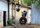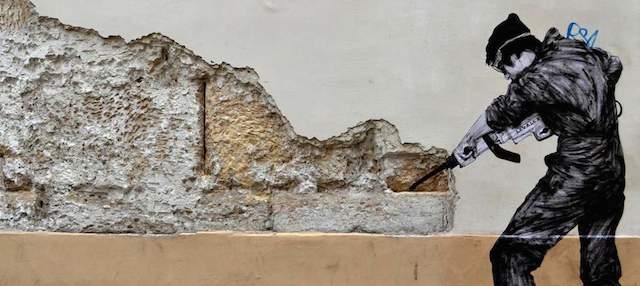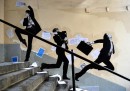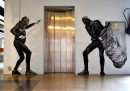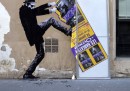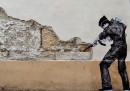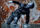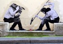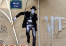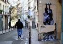 Charles Leval, conosciuto anche come Levalet, è un artista francese che vive a Parigi. Levalet disegna con l’inchiostro di china dei poster in bianco e nero, soprattutto di figure umane a grandezza naturale che poi incolla sui muri per le strade di Parigi. I personaggi di Levalet sono creati in modo da interagire con gli elementi urbani, come grondaie, condizionatori, finestre e piante. Prima di realizzare un’opera, Levalet – che condivide spesso le immagini dei suoi lavori sulla sua pagina Facebook – cammina per le strade per cercare la sistemazione adatta e a prendere misure. Poi fa il disegno e torna sul posto per incollarlo sui muri.