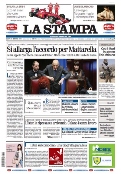 Tutti i titoli di apertura dei giornali di oggi sono dedicati all’elezione del Presidente della Repubblica e alla quarta votazione prevista per stamattina che, dopo i due voti di ieri in cui nessun candidato ha raggiunto il quorum, dovrebbe portare all’elezione di Sergio Mattarella, grazie alla riduzione del quorum necessario all’elezione. Il titolo più diffuso è “il giorno di Mattarella”, ma troviamo anche “strada spianata”, “a un passo dal Colle”, mentre il Corriere e la Stampa hanno titoli più neutri: “più consensi”, “si allarga l’accordo”.