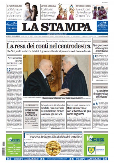 I giornali di oggi si occupano in apertura delle prime mosse nel nuovo Presidente della Repubblica Sergio Mattarella, che ieri ha telefonato all’ex presidente Ciampi e ha incontrato Napolitano, e della situazione all’interno dei partiti di centrodestra, usciti malconci dalla votazione di sabato che ha eletto Mattarella presidente.