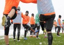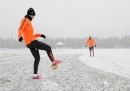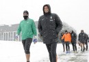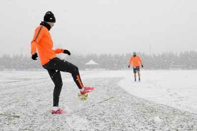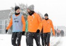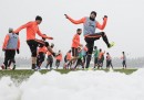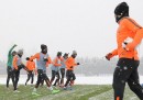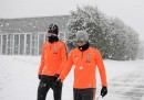 Oggi i calciatori della Juventus si sono allenati nel campo di Vinovo in vista della partita del Milan, che si giocherà sabato. Le foto sono particolarmente belle grazie alla neve che veniva giù – come in molte altre zone d’Italia – e che ha imbiancato il campo, le reti e i giocatori infreddoliti.