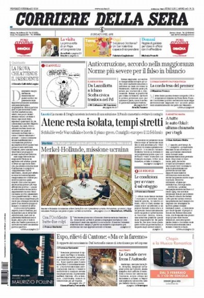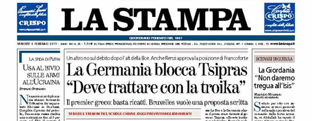 La decisione della BCE di sospendere uno dei suoi piani di aiuto all’economia della Grecia occupa spazio rilevante su tante prime pagine di oggi e segna di fatto l’inizio della complicata trattativa sul debito greco con le istituzioni europee promessa dal nuovo primo ministro Alexis Tsipras. Le notizie di politica italiana girano invece ancora intorno ai rapporti tra il PD e Forza Italia.