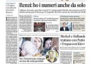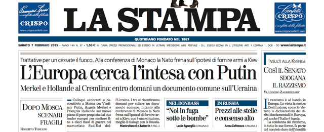 Molti giornali di oggi aprono con l’incontro del presidente russo Vladimir Putin con il presidente francese Francois Hollande e il cancelliere tedesco Angela Merkel, che hanno presentato una proposta di pace per la guerra in Ucraina orientale. Nei titoli si parla poi, per quanto riguarda la politica interna, della questione delle riforme, dell’accordo tra Matteo Renzi e Silvio Berlusconi e del passaggio al Partito Democratico di otto parlamentari di Scelta Civica.
