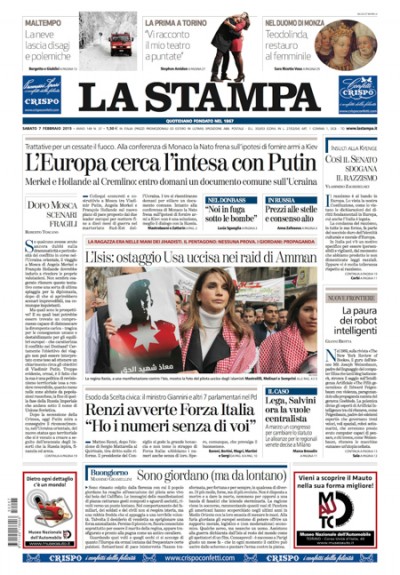 L'incontro tra Hollande, Merkel e Putin sulla guerra in Ucraina, la presunta morte dell'ostaggio americano prigioniero dell'IS e i voti di Forza Italia sulle riforme
