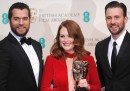 Grand Budapest Hotel di West Anderson è stato il film più premiato: ha ricevuto cinque BAFTA, tra cui Migliori costumi, Miglior colonna sonora e Migliore sceneggiatura originale. Birdman – che aveva ricevuto 10 candidature e considerato tra i favoriti come Miglior film per gli Oscar – ha ottenuto soltanto il premio alla fotografia. The Imitation Game, con Benedict Cumberbatch nel ruolo di Alan Turing, non ha ricevuto alcun premio nonostante nove candidature. Interstellar ha vinto per gli effetti speciali, Lego Movie come Miglior film di animazione e Citizenfour, che racconta di Edward Snowden e dell’inchiesta sulla NSA, è stato scelto come Miglior documentario.