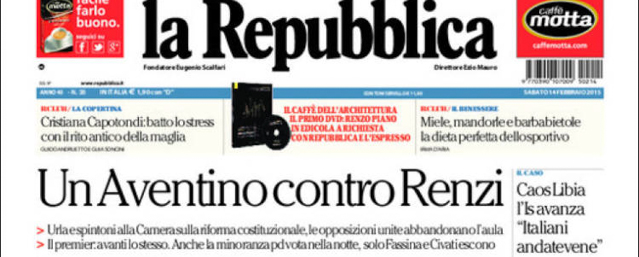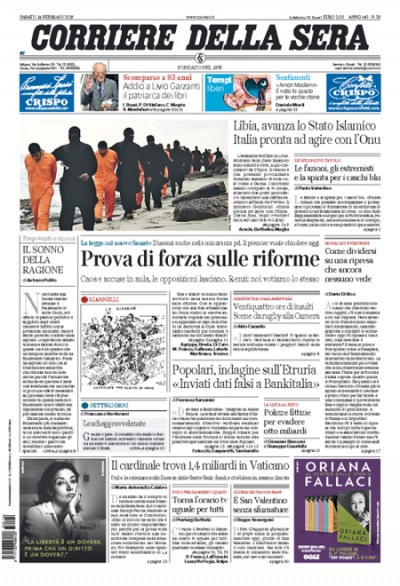 La maggior parte dei quotidiani nazionali apre con le risse e le discussioni alla Camera dei Deputati, dove da alcuni giorni si stanno votando gli emendamenti al disegno di legge sulle riforme costituzionali. Diversi titoli sono dedicati anche allo Stato Islamico in Libia e alla telefonata registrata fra Claudio Lotito e Pino Iodice, direttore generale dell’Ischia Isolaverde, fatta dal primo per convincere il secondo a sostenere Mario Macalli.