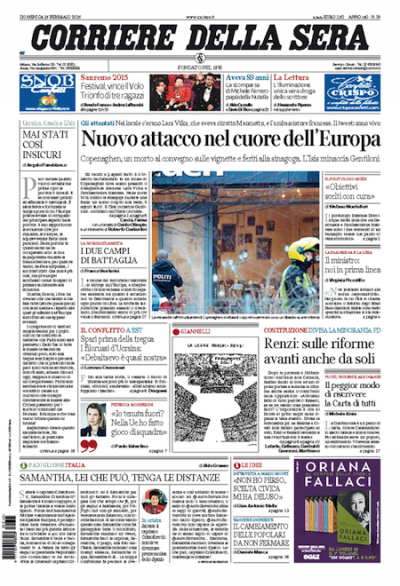 Le notizie presenti praticamente ovunque sulle prime pagine di quotidiani sono tre: l’attentato al locale di Copenaghen, durante il quale è stata uccisa una persona e altre tre sono state ferite, la morte dell’ex presidente del gruppo Ferrero Michele Ferrero (considerato l’uomo più ricco d’Italia) e la vittoria del gruppo “Il Volo” dell’edizione del Festival di Sanremo. I giornali sportivi si occupano delle partite di oggi di Serie A e della sconfitta del Napoli per 3-1 contro il Palermo.