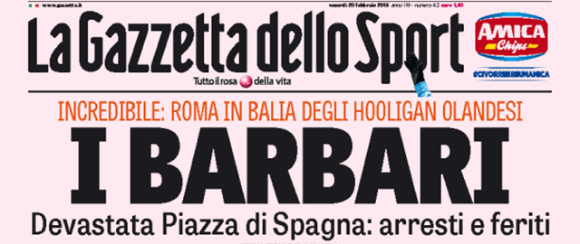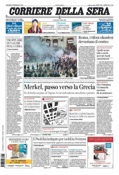 I danni dei tifosi olandesi del Feyenoord a Roma sono su tutte le prime pagine dei giornali di oggi, anche quelli locali, e d’altra parte le foto di Piazza di Spagna rovinata sono particolarmente forti. Per il resto ci si occupa molto della Grecia, visto che ci aspetta un altro giro di delicate trattative sul debito e il programma di aiuti. Si parla meno di Libia, rispetto ai giorni scorsi.