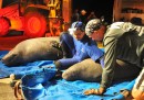 Nella notte tra lunedì 23 e martedì 24 alcuni lamantini (il numero non è chiaro, si va da 15 a 20) sono stati salvati dopo essersi persi nei canali di drenaggio a Satellite Beach, in Florida. I lamantini sono grossi mammiferi acquatici simili ai trichechi, lunghi fino a quattro metri e pesanti quasi 600 chili; erano rimasti intrappolati negli scarichi, dove si erano infilati attirati dall’acqua tiepida e per evitare quella troppo fredda della baia, che in questo periodo ha toccato temperature insolitamente basse, anche sotto i 13 gradi. I lamantini soffrono quando la temperatura dell’acqua scende sotto i 20 gradi e finiscono per ripararsi in posti pericolosi, come vicino alle centrali elettriche.