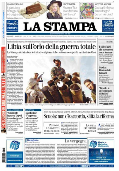 La notizia di apertura per la maggior parte dei quotidiani di oggi è la riforma della scuola, che doveva essere esaminata nel Consiglio dei ministri di ieri ma è stata rinviata a un disegno di legge che dovrebbe essere approvato la settimana prossima, con l’assicurazione da parte del governo che le assunzioni dei precari non slitteranno. La Stampa e il Secolo XIX titolano invece sulle trattative diplomatiche per un intervento militare in Libia, mentre il Manifesto si occupa del discorso di Netanyahu al Congresso degli Stati Uniti.