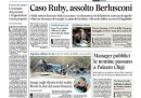 La notizia di apertura per quasi tutti i giornali di oggi, arrivata ieri a tarda sera, è l’assoluzione definitiva da parte della Cassazione per Silvio Berlusconi nel processo Ruby. I giornali che avevano già chiuso prima che arrivasse la sentenza titolano invece sull’approvazione da parte della Camera del disegno di legge sulle riforme istituzionali, nonostante le divisioni in Forza Italia e nel PD sul testo, mentre su quasi tutte le prime pagine si trovano anche le notizie dell’espulsione del sindaco di Verona Flavio Tosi dalla Lega e dell’incidente fra due elicotteri in Argentina durante le riprese di un reality francese in cui sono morte dieci persone, fra le quali alcuni campioni sportivi. I quotidiani sportivi titolano sulla possibile cessione di una quota del Milan a un socio cinese, sulla quale ieri si sono diffuse voci e smentite.