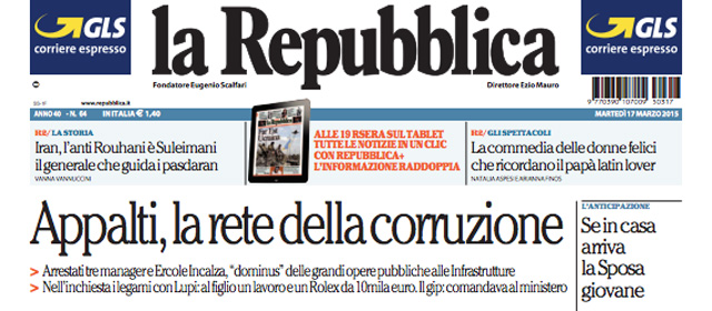 L’apertura di tutti i quotidiani di oggi è dedicata all’indagine della procura di Firenze sui grandi appalti che ha portato ieri all’arresto di quattro persone fra i quali il dirigente del Ministero dei Lavori Pubblici Ercole Incalza, e che secondo le prime voci potrebbe coinvolgere anche il Ministro Lupi e il figlio. L’Osservatore Romano e Avvenire titolano invece sulle persecuzioni contro i cristiani in Pakistan.