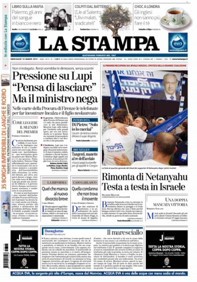 L’indagine sulla corruzione nei grandi appalti e le pressioni sul ministro delle Infrastrutture Lupi perché si dimetta per i suoi rapporti con le persone accusate dai magistrati di Firenze sono la notizia di apertura su tutti i giornali di oggi, affiancata sui principali quotidiani nazionali dai primi dati provenienti dagli exit poll per le elezioni in Israele, che danno alla pari il Likud di Netanyahu e il partito di Herzog. I quotidiani sportivi presentano la partita di ritorno degli ottavi di finale di Champions fra Juventus e Borussia Dortmund che si gioca stasera in Germania.