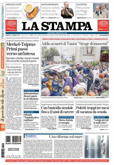 Sui giornali di oggi ci sono notizie diverse in apertura: l’incontro di Berlino fra il cancelliere tedesco Merkel e il primo ministro greco Tsipras per trattare sul debito greco, le parole del ministro del lavoro Poletti che vorrebbe ridurre il periodo di vacanze estive nelle scuole, ancora le indagini sulle grandi opere, la cessione di Pirelli ad un gruppo cinese, e la prescrizione per Moggi e Giraudo nel processo per calciopoli.