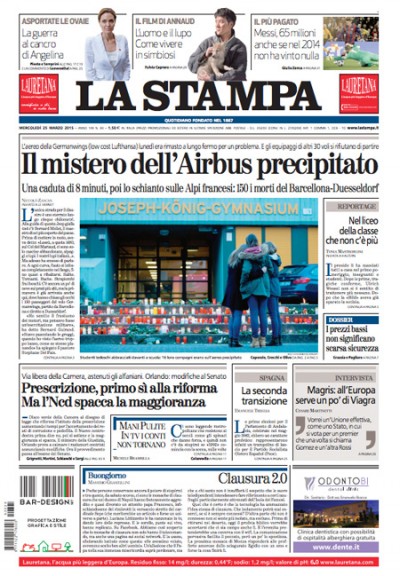 La notizia in apertura su tutti i giornali di oggi è quella dell’aereo della compagnia low cost tedesca Germanwings in volo fra Barcellona e Düsseldorf precipitato sulle montagne dell’Alta Provenza, in Francia, causando la morte di tutti i 150 passeggeri a bordo, e la parola più citata nei titoli è “mistero”. Fanno eccezione il Giornale e il Fatto, che titolano criticando (per motivi opposti) la riforma della prescrizione votata ieri alla Camera, il Manifesto, che si occupa della manifestazione di Landini di sabato prossimo a Roma, e Avvenire e il Sole 24 Ore, che aprono sul voto del Senato che ieri ha approvato definitivamente il decreto sulle banche che contiene la riforma delle banche popolari.
