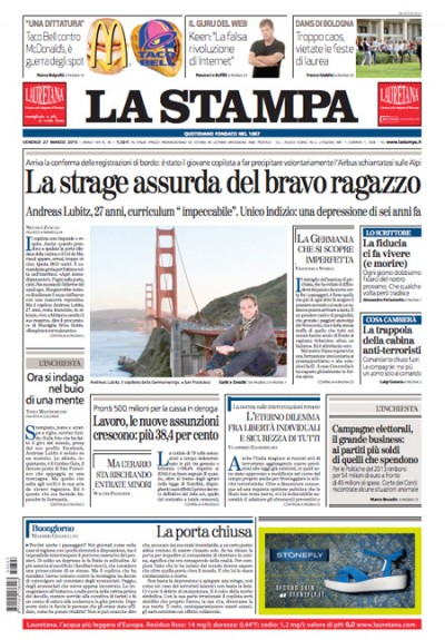 L’apertura di tutti i giornali di oggi è dedicata al volo della Germanwings precipitato sulle Alpi francesi per colpa del copilota Andreas Lubitz (paragonato dal Giornale al comandante Schettino della Costa Concordia), che si è chiuso da solo nella cabina di pilotaggio e ha portato l’aereo a scontrarsi con la montagna, come si è capito dall’esame delle registrazioni delle voci a bordo contenute nella scatola nera. Le uniche eccezioni sono il Fatto, che critica la gestione dei fondi dell’Expo di Milano, e il Manifesto, che titola sulle parole del Ministro Poletti contrario alle proposte sul reddito minimo.
