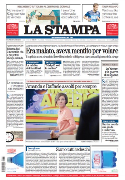 Le due notizie che si dividono le aperture dei principali quotidiani di oggi sono le indagini sul copilota del volo Germanwings precipitato sulle Alpi francesi, che avrebbe nascosto alla compagnia aerea i certificati medici che attestavano la sua non idoneità a lavorare, e l’assoluzione definitiva disposta dalla Cassazione per Raffaele Sollecito e Amanda Knox nel processo per l’omicidio di Meredith Kercher. Il Manifesto titola invece sulla manifestazione di oggi a Roma organizzata dalla FIOM di Landini, mentre i quotidiani sportivi si occupano della lite fra la Juventus e l’allenatore della nazionale Conte per l’infortunio del calciatore Marchisio.