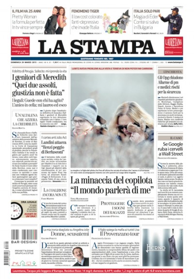 Le prime pagine dei giornali di oggi danno spazio soprattutto alla manifestazione organizzata dai sindacati Fiom e Cgil a piazza del Popolo, a Roma, per protestare contro il Jobs Act, la legge delega per la riforma del lavoro, e ai commenti sull’operato del presidente del Consiglio Matteo Renzi fatti dal palco dal segretario della Fiom Maurizio Landini. Si parla poi anche delle reazioni all’assoluzione definitiva per Raffaele Sollecito e Amanda Knox per l’omicidio di Meredith Kercher, e alle ultime scoperte su Andreas Lubitz, il copilota del volo Germanwings che si è schiantato martedì scorso sulle Alpi francesi. Le prime pagine sportive invece sono interamente dedicate al pareggio della Nazionale nella partita di qualificazione per gli Europei del 2016 contro la Bulgaria, finita 2 a 2.