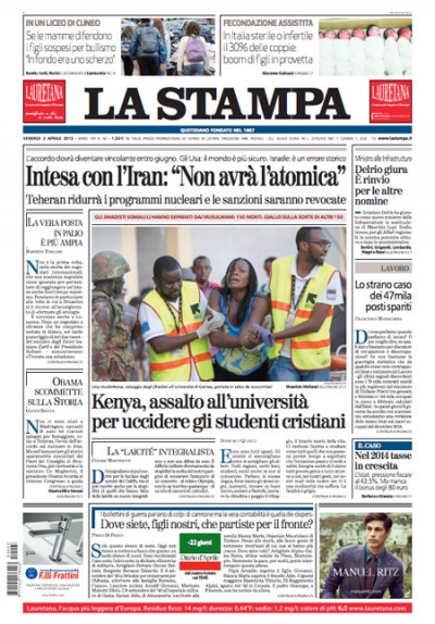In apertura sui principali quotidiani nazionali di oggi ci sono due notizie: l’accordo quadro raggiunto a Losanna sul nucleare iraniano, che dovrà essere completato entro il 30 giugno, e la strage del gruppo estremista al Shabaab in una università in Kenya, che ha provocato almeno 150 morti fra gli studenti cristiani. I quotidiani sportivi tornano sulla possibile cessione del Milan a un imprenditore cinese.