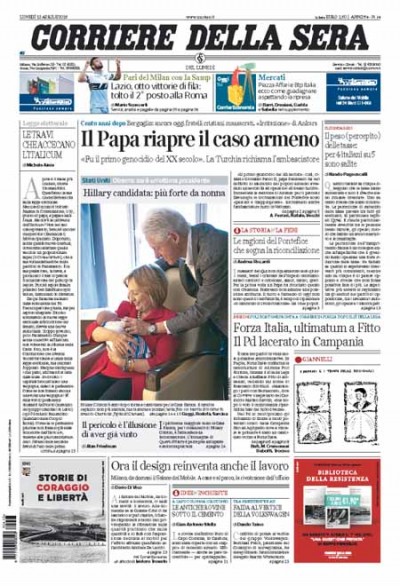 Ci sono soprattutto tre notizie nei principali titoli di prima pagina dei giornali a tiratura nazionale: le parole del Papa sul genocidio armeno, che hanno fatto arrabbiare la Turchia; la candidatura ufficiale di Hillary Clinton alla presidenza degli Stati Uniti e il sorpasso della Lazio sulla Roma nella classifica della Serie A. Si distingue parzialmente Repubblica, che dedica il suo titolo principale alle decisioni economiche del governo Renzi nella destinazione delle risorse aggiuntive previste dal Documento di Economia e Finanza.