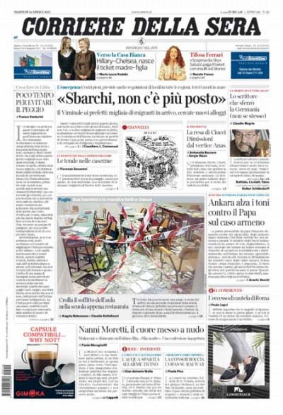 Il crollo dell’intonaco dal soffitto di una scuola elementare pugliese è il titolo di apertura su molti quotidiani, e quasi tutti questi titolano in modo sarcastico, indice del fatto che lunedì non è successo poi moltissimo. Tra le altre notizie citate: un’intervista al direttore dell’agenzia delle entrate, la morte di Günter Grass e di Eduardo Galeano, le dimissioni del presidente dell’ANAS. E Juventus-Monaco di Champions League, che si gioca stasera.