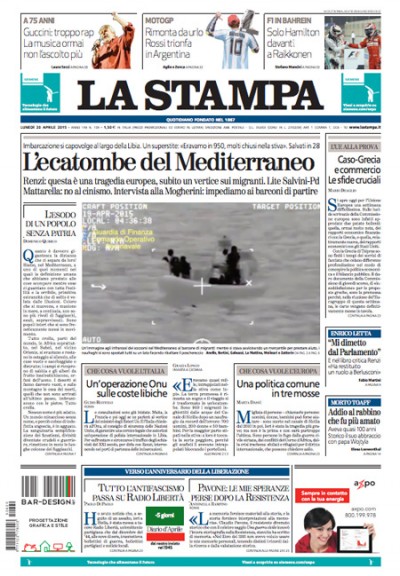 I titoli di apertura delle prime pagine dei quotidiani nazionali di oggi sono tutti dedicati al naufragio della nave di migranti nel Canale di Sicilia nella notte fra sabato e domenica, per il quale il bilancio è ancora incerto ma si teme che il numero delle vittime possa raggiungere le 900 persone, e alle polemiche sulle politiche di accoglienza e di contrasto degli sbarchi. I quotidiani sportivi titolano sulla vittoria di Valentino Rossi nella MotoGP.