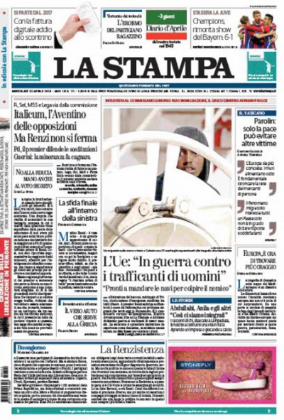 L’apertura per la maggior parte dei quotidiani nazionali di oggi è ancora dedicata all’immigrazione dall’Africa, con le indagini sulla dinamica del naufragio di sabato scorso, forse causato da una collisione, e le ipotesi di intervento militare da parte dell’Unione Europea nei porti della Libia per colpire i barconi prima della partenza. Accanto a queste notizie molto spazio è occupato dalle tensioni sulla legge elettorale, con la minaccia delle opposizioni di ritirarsi dai lavori in Commissione, mentre i quotidiani sportivi presentano la partita di stasera fra Monaco e Juventus per decidere chi si qualificherà alle semifinali di Champions League.