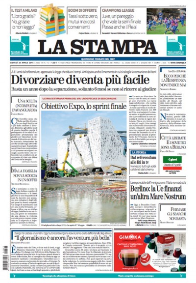 Le notizie che si dividono l’apertura dei quotidiani sono il Consiglio europeo straordinario sull’immigrazione in programma oggi a Bruxelles che dovrebbe decidere quali regole attuare per bloccare le partenze dei barconi dall’Africa, l’approvazione definitiva della nuova legge sul divorzio, che accorcia i tempi di attesa dopo la separazione, e il voto favorevole in Commissione Affari Costituzionali sulla legge elettorale, che sarà esaminata in aula alla Camera da lunedì, mentre i giornali sportivi celebrano il pareggio con il Monaco della Juventus, che si qualifica per le semifinali di Champions League insieme a Real Madrid, Barcellona e Bayern Monaco.