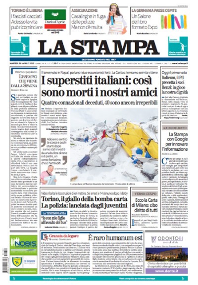 L’apertura dei principali quotidiani di oggi è divisa fra le notizie che arrivano dal Nepal sul bilancio del terremoto, con il numero delle vittime che secondo le stime è destinato a superare i 6.000 morti e la conferma del Ministero degli Esteri di 4 morti italiani e 40 persone di cui non si hanno notizie, e l’inizio dell’esame da parte della Camera della riforma elettorale, per la quale il Presidente del Consiglio Renzi ha scritto una lettera al Partito Democratico per sollecitarne l’approvazione.