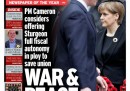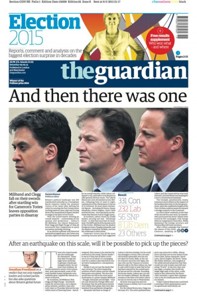 Quando le redazioni britanniche hanno chiuso i numeri di venerdì 8 maggio, il giorno seguente alle elezioni parlamentari britanniche, avevano a disposizione solo i dati degli exit poll, che comunque preannunciavano una vittoria di David Cameron. Nella giornata di venerdì sono poi arrivati i dati definitivi, e le notizie delle dimissioni del leader del partito laburista Ed Miliband, di quello dei LibDem Nick Clegg e di quello dello UKIP Nigel Farage. I giornali di sabato 9 maggio aprono quindi sui risultati definitivi delle elezioni e sulle cose successe nei vari partiti ieri. Il Guardian e il Daily Mirror hanno scelto lo stesso titolo: «E poi ne rimase uno solo», riprendendo il famoso racconto di Agatha Christie “Dieci piccoli indiani”; il Daily Telegraph chiama Cameron «Il Prescelto», mentre l’Independent evoca «La strana morte della Gran Bretagna liberal». Lo Scotsman e l’Herald, giornali scozzesi, dedicano la prima pagina comprensibilmente a Nicola Sturgeon, leader dello Scottish National Party che ha ottenuto un enorme successo in Scozia, conquistando 56 seggi su 59.