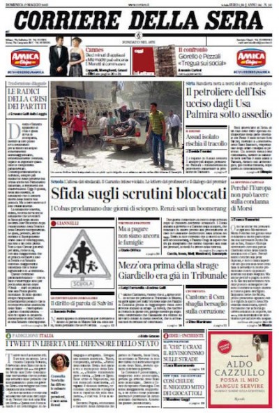 Ciascuno dei principali quotidiani a diffusione nazionale ha scelto oggi di aprire con una notizia diversa. Il Corriere della Sera mette in prima pagina lo sciopero degli scrutini della scuola indetto dai COBAS. Repubblica apre con la notizia che il decreto legge sulle pensioni verrà approvato in settimana. La Stampa apre invece con la storia dell’uccisione di un importante capo dell’ISIS da parte degli Stati Uniti. I giornali sportivi parlano della sconfitta dell’Inter contro la Juventus nell’anticipo di ieri di Serie A.