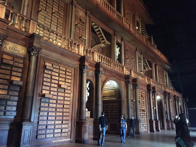 La prima stanza in cui si entra è quasi spiazzante: i visitatori probabilmente non si aspetterebbero di trovarsi davanti a un enorme archivio di legno, elegante e pieno di cassettoni, che ricorda molto una vecchia biblioteca. Qui è conservata la memoria dei vari riti e delle pratiche dell’alimentazione che si sono succedute nei secoli dell’umanità. Proseguendo si passa sotto un arco per arrivare nella sala successiva, in cui la parete dell’archivio viene utilizzata per proiettare immagini dedicate a caccia, pesca, coltivazione e allevamento. Nella stessa sala è stato ricostruito un grande albero, alto 23 metri, che “buca” il soffitto ed esce oltre il tetto, per sottolineare il dominio della natura sull’uomo.