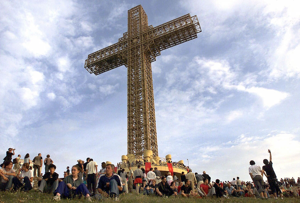nella foto: l’enorme croce di metallo in cima al Monte Vodno, sopra Skopje, la capitale della Macedonia (AP Photo/Boris Grdanoski)