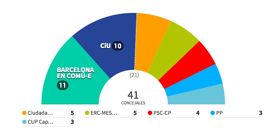A Barcellona, la seconda città più grande della Spagna, ha vinto la coalizione Barcelona en Comu di Ada Colau, appoggiata da diversi movimenti e formazioni politiche di sinistra, Podemos compreso. Ha battuto il sindaco uscente nazionalista catalano Xavier Trias, che quattro anni fa aveva vinto con i socialisti che sono passati dall’essere il secondo partito della città a diventare il quinto. Colau fa parte della “Piattaforma vittime del mutuo” (PAH), nata dal movimento dei cosiddetti “Indignados”, e famosa per la sua proposta di una legge di iniziativa popolare per facilitare l’estinzione dei debiti dei cittadini alle prese con la crisi economica.