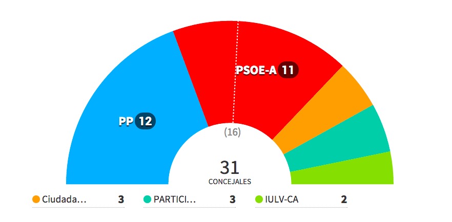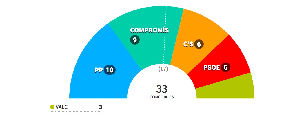A Valencia il PP ha ottenuto il 25,71 per cento dei voti, ma anche in questo caso la sinistra con Coalició Compromís (23,28 per cento) e Ciudadanos (15,38 per cento) potrebbe governare la città. Il PSOE ha ottenuto il 14,07 per cento dei voti.