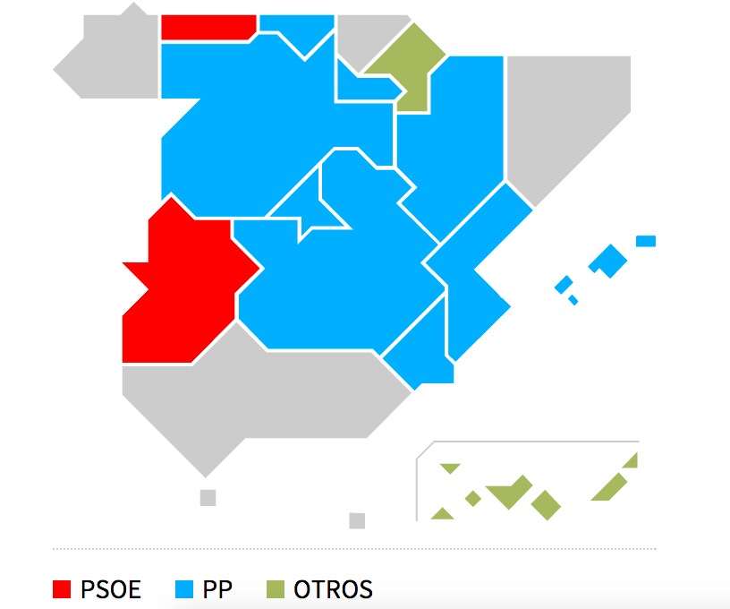 Nelle regioni ha prevalso il PP eccetto che in Estremadura e nelle Asturie dove la maggioranza relativa è stata ottenuta dal PSOE. Nella Navarra la maggioranza relativa è andata al partito Unión del Pueblo Navarro, UPN, di centrodestra, e alle Canarie a una coalizione nazionalista sempre di centrodestra. Nonostante risulti il partito più votato, il PP ha perso le maggioranze assolute che aveva invece ottenuto nel 2011 perdendo diversi seggi. In diverse di queste regione, è quindi probabile che si possano formare maggioranze di sinistra (Aragona, Asturie, Cantabria, Castilla-La Mancha, Valencia ed Estremadura). In regioni come Madrid, Castilla e León, La Rioja e Murcia il PP potrebbe invece governare, ma solo stringendo qualche accordo politico, non avendo ottenuto la maggioranza.