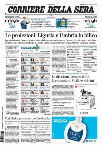 Tutte le prime pagine dei giornali di oggi basano i loro titoli sui risultati delle elezioni regionali, naturalmente, ma lo spoglio è iniziato soltanto alle 23 e quindi la gran parte dei giornali – che ha chiuso la prima pagina tra mezzanotte e l’una del mattino – ha deciso come titolare sulla base di exit poll e proiezioni. Poteva andare peggio, ma anche meglio: l’Umbria nel quale alcuni danno il centrodestra in vantaggio, alla fine pare sia andata al centrosinistra; in Liguria invece le prime equilibrate proiezioni a favore del centrodestra sono state poi confermate dallo scrutinio.