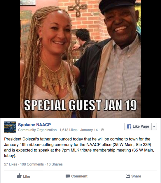Aggiornamento del 15 giugno: Rachel Dolezal si è dimessa da presidente della NAACP di Spokane dopo le accuse di aver mentito sulle sue origini, dicendo di essere afroamericana. Dolezal ha annunciado le sue dimissioni dicendo in un post su Facebook di averle rassegnate «per lealtà verso i principi di giustizia sociale e raziale della NAACP» e di aver passato le sue funzioni alla vicepresidente della NAACP di Spokane.