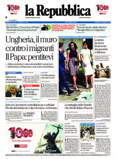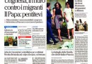 L’annuncio del ministro degli Esteri ungherese Peter Szijjarto dell’imminente costruzione di un muro lungo 175 chilometri sul confine con la Serbia per fermare i migranti irregolari è la notizia più presente sulle prime pagine dei giornali di oggi. Più in generale, si parla ancora molto di immigrazione, della situazione di Ventimiglia e delle critiche del Papa a Matteo Salvini sui respingimenti dei clandestini. Si parla anche della prima prova della Maturità, che è stata svolta ieri (oggi ci sarà la seconda prova), dei problemi di Renzi con la riforma della scuola, e infine anche della visita in Italia e a EXPO di Michelle Obama con le sue due figlie. Sui giornali sportivi, per cambiare, oggi si parla molto dell’incidente d’auto del calciatore della Juventus Arturo Vidal e del suo arresto per guida in stato di ebbrezza.