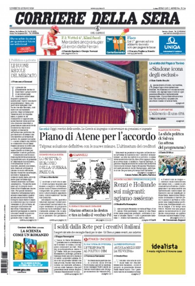 Sulle prime pagine dei giornali di oggi viene dato molto spazio al nuovo possibile accordo tra la Grecia e i suoi creditori: ieri il primo ministro greco Alexis Tsipras ha presentato una nuova proposta per risolvere la crisi della Grecia ai paesi dell’Unione europea, che la discuteranno oggi. Diversi giornali scelgono di mettere in prima pagina le cose dette da Papa Francesco su lavoro e immigrazione durante la sua visita di ieri a Torino. Si parla anche dell’incontro tra Renzi e il primo ministro francese Hollande a Expo, durante il quale si è parlato tra le altre cose della situazione dei migranti che da giorni sono bloccati sul confine tra Italia e Francia, a Ventimiglia, e che la Francia non sembra essere intenzionata a fare passare.