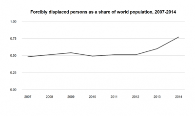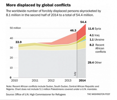 Secondo l’ONU negli anni dal 2007 al 2012 il rapporto tra il numero di migranti e la popolazione mondiale è rimasto più o meno costante ogni anno: negli ultimi due anni però la percentuale di persone che hanno lasciato le proprie case a causa di una guerra, rapportata al numero della popolazione mondiale, è aumentata di oltre il 50 per cento. Il numero di migranti alla fine del 2014 è di quasi 60 milioni di persone, nel 2013 si parlava di 51,2 milioni e di 37,5 milioni dieci anni fa. C’è dunque stato un incremento maggiore rispetto a quello della crescita della popolazione mondiale. In tutto il mondo una persona ogni 133 è un profugo, un richiedente asilo o uno sfollato all’interno del suo stesso paese. Due anni fa il rapporto era di 1 a 200.