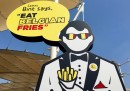 Anche nel chiosco di Expo le porzioni di patatine – che costano 4 euro, ma ce ne sono davvero tante – vengono servite in un cono, con una “tasca” laterale per mettere la salsa scelta. Anche salse ce ne sono moltissime: ketchup, maionese, salse a base di pomodorini e cipolle, piccanti, al curry. Di fianco al chiosco c’è anche un cartonato di James Bint – il nome è un misto di James Bond e della varietà di patata “Bintje” – cioè la mascotte ufficiale delle frites a Expo, con cui la gente può farsi un selfie, e che è il protagonista del video che spiega i segreti delle patatine fritte del Belgio.