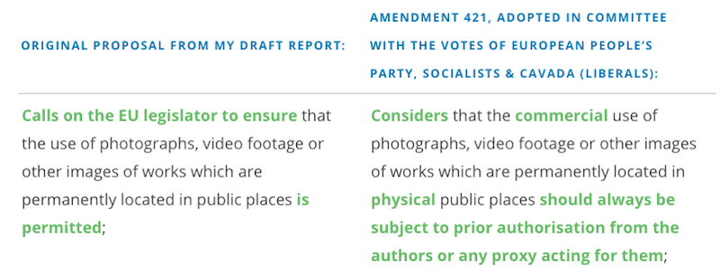 L’oggetto dell’emendamento è la cosiddetta Freedom of Panorama: nella sua proposta originale, Renda invita ad approvare leggi che permettano la libera pubblicazione di foto o video di «opere che siano permanentemente poste in un luogo pubblico» (al momento, la direttiva del 2001 prevede che ogni stato possa avere una propria legge indipendente sul tema). L’emendamento di Cavada, approvato dalla Commissione, invita invece ad adottare una legge che «per quanto riguarda l’utilizzo commerciale di opere fisiche poste in luogo pubblico, obblighi a chiedere l’autorizzazione agli autori».