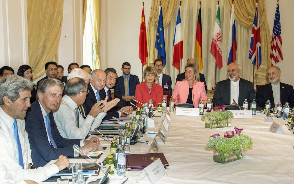Da sinistra a destra: il segretario di stato americano John Kerry, il ministro degli Esteri britannico Philip Hammond, il ministro degli Esteri russo Sergey Lavrov, il ministro degli Esteri tedesco Frank-Walter Steinmeier, il ministro degli Esteri francese Laurent Fabius, il ministro degli Esteri cinese Wang Yi, il segretario generale per il Servizio esterno della UE Helga Schmid, l’Alto rappresentante dell’Unione per gli affari esteri e la politica di sicurezza Federica Mogherini, il ministro degli Esteri iraniano Mohammad Javad Zarif e l’ambasciatore iraniano all’Agenzia Internazionale per l’Energia Atomica Ali Akbar Salehi. L’incontro si è svolto il 6 di luglio all’hotel Palais Coburg di Vienna.