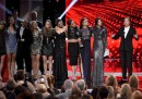 Anche la consegna dell’Arthur Ashe Award è stata piuttosto commovente. Il premio viene assegnato ogni anno ad atleti che hanno compiuto scelte particolarmente coraggiose (Arthur Ashe è stato un importante tennista statunitense morto di AIDS a causa di una trasfusione), e quest’anno è andato a Caitlyn Jenner, precedentemente conosciuta come Bruce Jenner, l’atleta statunitense che nel 1976 vinse la medaglia d’oro nel decathlon alle Olimpiadi di Montréal del 1976. Jenner ha dichiarato di essere transessuale lo scorso aprile e a giugno è apparsa in un’ormai famosa copertina di Vanity Fair nella sua nuova identità di donna, contribuendo a far parlare molto dei diritti delle persone transgender.