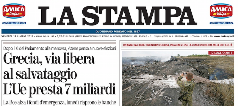 Anche oggi molti titoli sulle prime pagine dei giornali italiani sono dedicati alla Grecia: ieri la Commissione europea ha approvato un prestito ponte da 7 miliardi di euro che servirà a far funzionare la Grecia nelle prossime settimane, la BCE ha invece deciso di aumentare i fondi ELA di aiuto al sistema bancario greco. Lunedì dopo tre settimane le banche in Grecia dovrebbero riaprire. Si parla molto anche dell’autosospensione del presidente della regione Sicilia Renato Crocetta, per un’intercettazione pubblicata dall’Espresso in cui il suo medico gli dice che Lucia Borsellino: «Va fatta fuori. Come suo padre». Infine ci sono titoli per i 4 militari uccisi in due basi negli Stati Uniti da un uomo armato poi ucciso a sua volta dalla polizia e per l’incontro tra Angela Merkel e la bambina migrante palestinese che si è messa a piangere per la sua difficile situazione di richiedente asilo. Sui giornali sportivi si parla solo di una cosa: il possibile arrivo alla Juventus del forte giocatore tedesco Götze.