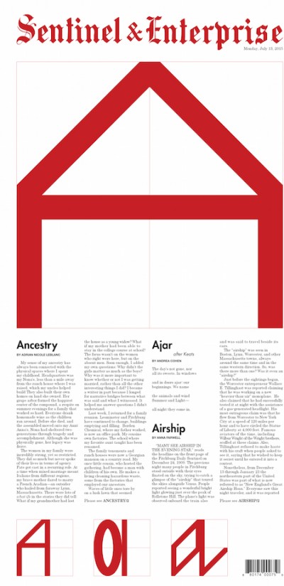 Un alfabeto artistico sulla prima pagina del “Sentinel & Enterprise”, per un mese