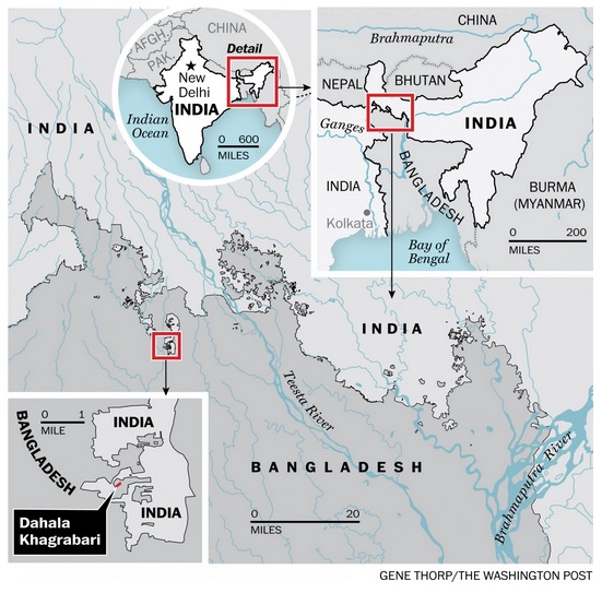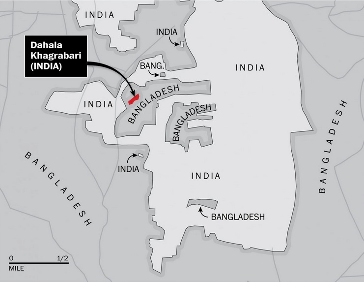 Per cartografi e amanti delle stranezze geopolitiche è la fine di un’era. Lo scambio tra India e Bangladesh significa che il mondo perderà uno dei suoi confini più bizzarri e una stranezza unica al mondo: l’enclave di terzo livello, cioè un’enclave, circondata da un’enclave, circondata da un’enclave circondata da un altro stato. La mappa qui sotto può aiutare a spiegare di cosa stiamo parlando. Dhahala Khagrabari, l’enclave di terzo livello in questione, era parte dell’India, circondata da un’enclave del Bangladesh, a sua volta circondata da un’enclave dell’India circondata dal Bangladesh.