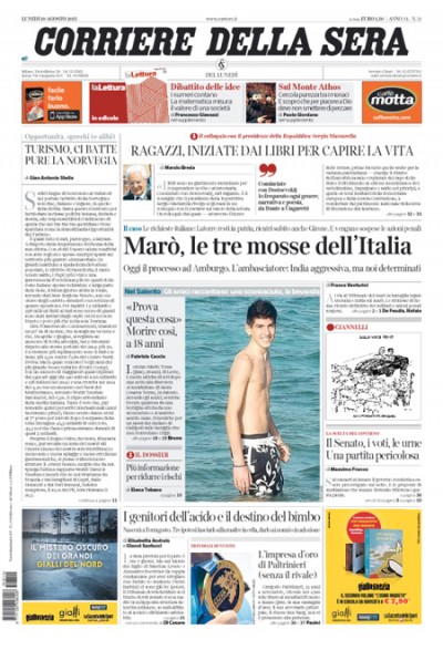 Il Corriere della Sera apre con gli sviluppi della situazione dei due fucilieri di marina Massimiliano Latorre e Salvatore Girone: oggi al Tribunale internazionale del diritto del mare di Amburgo inizierà l’arbitrato chiesto dall’Italia per trovare un accordo con l’India, dopo oltre tre anni di detenzione dei due militari italiani. La Stampa, invece, apre con i nuovi numeri sui rimpatri dei clandestini arrivati in Italia negli ultimi 7 mesi e Repubblica si occupa dei nuovi piani del governo per favorire la ripresa economica. Diversi giornali parlano del ragazzo di 18 anni morto in Puglia probabilmente per delle complicazioni legate all’assunzione di droghe e alcol. Molto spazio sulle prime pagine, infine, è dato alla vittoria di Gregorio Paltrinieri nei 1.500 stile libero ai Mondiali di nuoto che si sono conclusi ieri in Russia. Sui giornali sportivi è dato molto spazio al nuovo acquisto del Milan: il giovane difensore italiano Alessio Romagnoli.